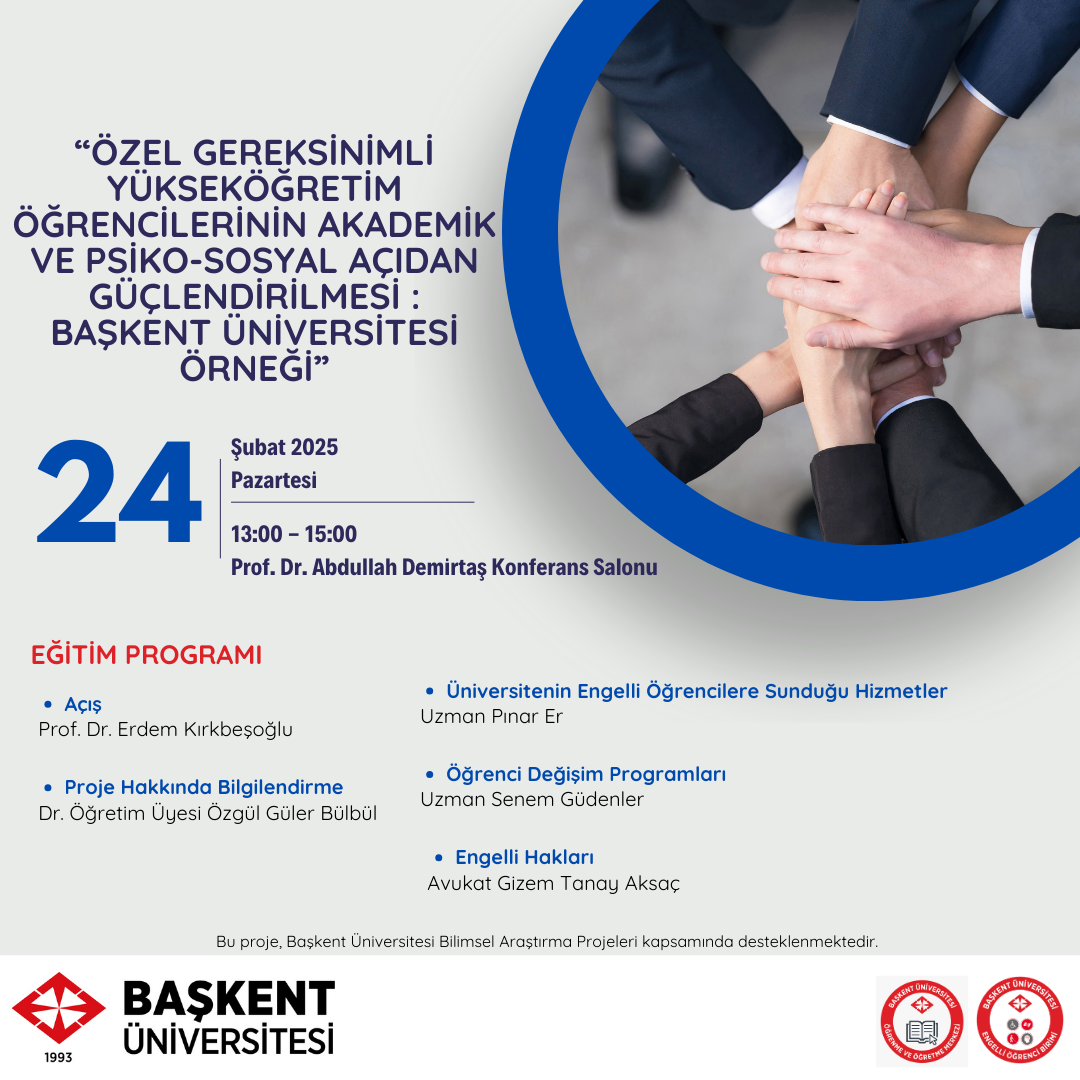 "Özel Gereksinimli Yükseköğretim Öğrencilerinin Akademik ve Psiko-sosyal Açıdan Güçlendirilmesi: Başkent Üniversitesi Örneği" isimli Bilimsel Araştırma Projesi kapsamında hazırlanan 1. Modül Eğitim Programına hepinizin katılımını bekliyoruz.