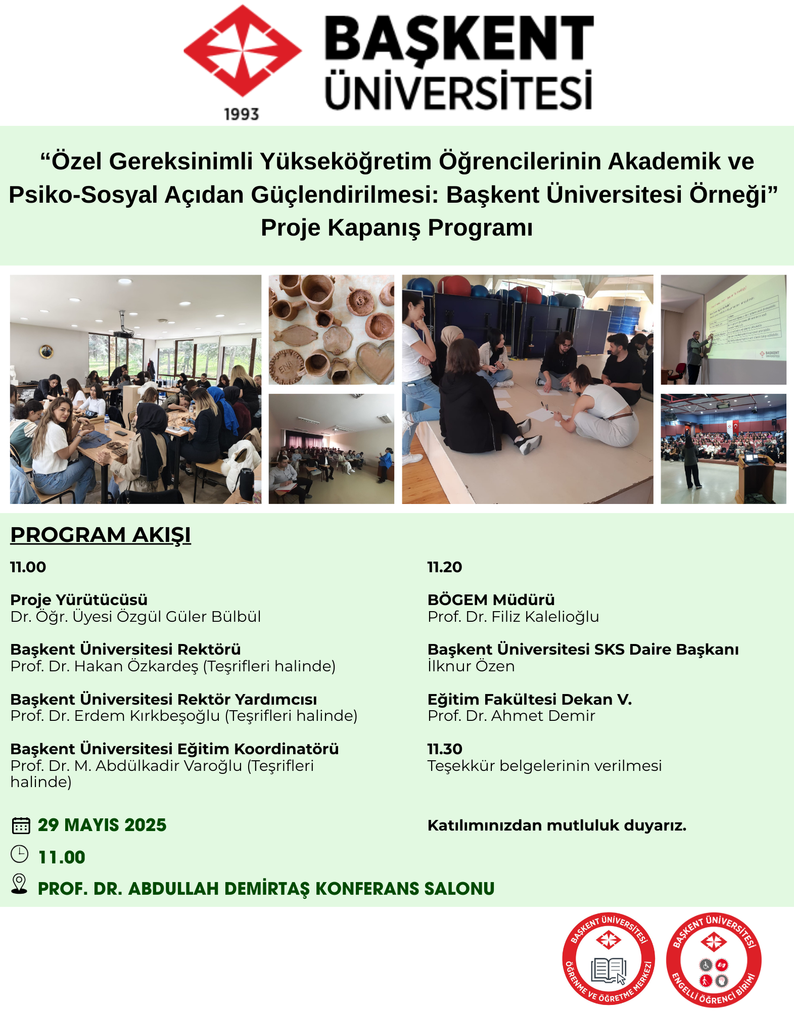 Özel Gereksinimli Yükseköğretim Öğrencilerinin Akademik ve Psiko-Sosyal Açıdan Güçlendirilmesi: Başkent Üniversitesi Örneği isimli projemizin kapanış oturumu 29 Mayıs 2025 tarihinde saat 11.00'de Prof. Dr. Abdullah Demirtaş Konferans Salonunda gerçekleşecektir.
