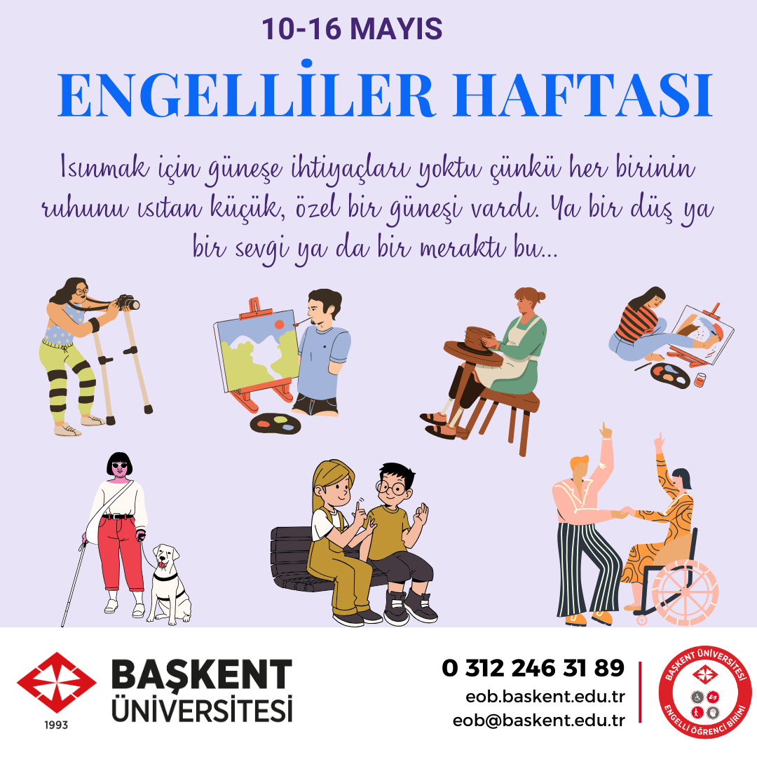 Açık lila bir renk üzerine tasarlanan afiş üzerinde en üstte mor renkte 10-16 Mayıs ve altında mavi rekte ENGELLİLER HAFTASI yazmaktadır.