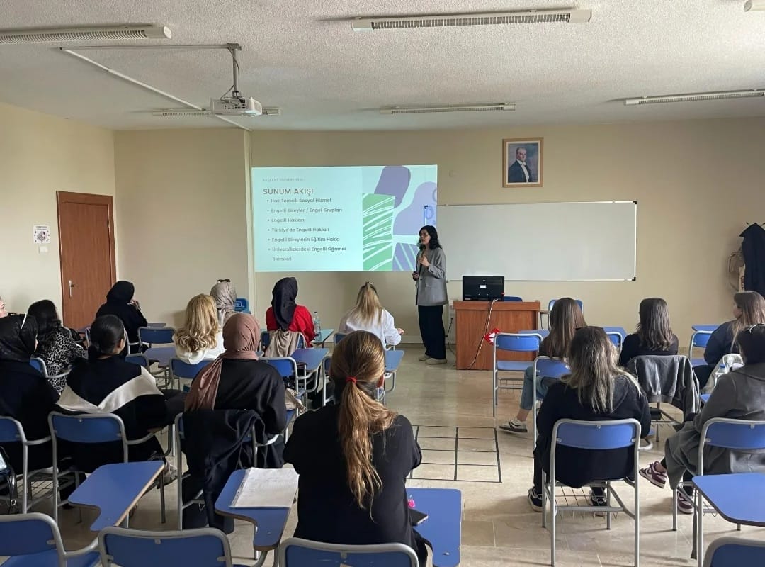Sosyal Bilimler MYO Engelli Öğrenci Birimi Temsilcisi ve Çocuk Gelişimi Programında görev yapan Öğr. Gör. Beyhan Özge Yersel'in yürütmüş olduğu Özel Eğitim II dersine birimimizin sosyal hizmet uzmanı Pınar ER, Hak Temelli Sosyal Hizmet Bağlamında Engelli Hakları başlıklı sunumu ile konuk olmuştur.