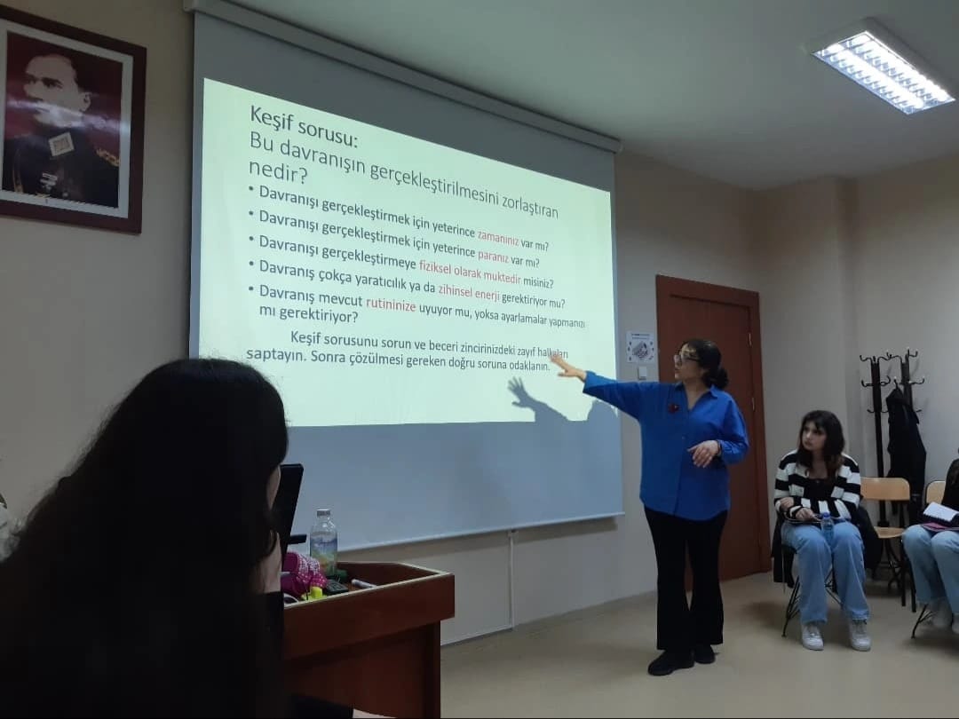 Özel Gereksinimli Yükseköğretim Öğrencilerinin Akademik ve Psikososyal Açıdan Güçlendirilmesi: Başkent Üniversitesi Projesi isimli bilimsel araştırma projemizin 2. modülünü gerçekleştirdik. İlk olarak Dr. Öğr. Üyesi Özgül Güler Bülbül kendini düzenleme stratejileri, hedef belirleme, kendini talimatlandırma, kendini izleme ve kendini pekiştirme konularında konuşmalrını gerçekleştirmiştir. ikinci eğitimde Dr. Öğr. Üyesi İmgehan Özkan Elgün, zaman yönetmi konusunda konuşmalarını gerçekleştirmiştir.